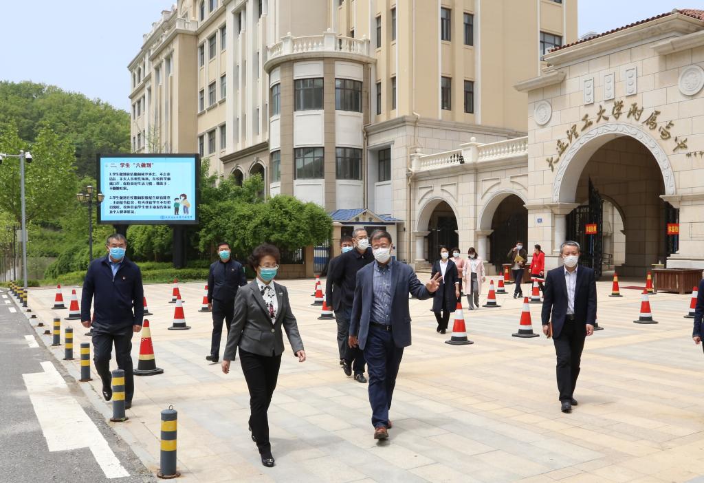 2020年5月17日上午,大连市政府副市长温雪琼、大连市教育局局长赵阳以及市教育局安体卫处相关责人等一行到大连理工大学附属高中,实地检查调研5月18日高一、高二年级复学返校工作准备情况。大连理工大学党委常委、副校长薛徽全程陪同,附属高中全体领导班子成员及相关教职工接受检查。