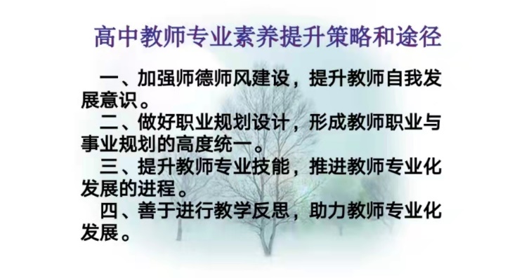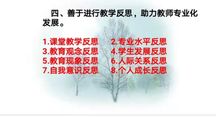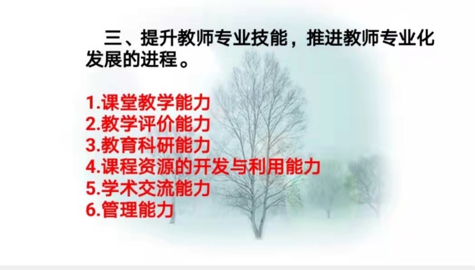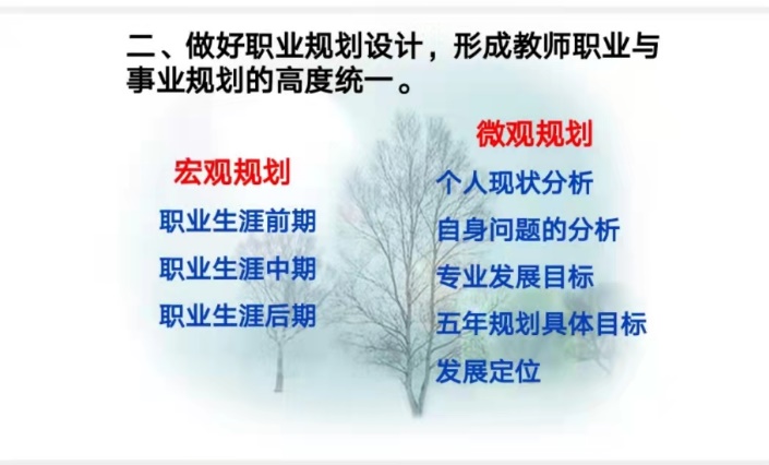 本次讲座,杨彦也教师从加强师德师风建设,提升教师自我发展意识;做好职业规划设计,形成教师职业与事业规划的高度统一;提升教师专业技能,推进教师专业化发展的进程;善于进行教学反思,助力教师专业化发展等四个方面,结合自身的教育教学经验,深入浅出地阐述了新课程下,高中思想政治教师应具有的学科素养:从“知识传授者”成为“政治思想的引导者”;肩负起“培养什么人”、“怎样培养人”、“为谁培养人”的历史使命,立场和观点必须旗帜鲜明,毫不含糊。同时,杨老师鼓励青年教师要尽早找准职业发展定位,潜心钻研,静心深耕,力争在3-5年内成为学校工作核心力量、市级教学骨干,形成自己独特的教育教学风格。
