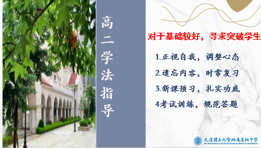 4、考试训练,规范答题:进入到高二,要逐渐开始培养自己的考试习惯,比如:答整套卷时不会合理分配时间,导致难题答不对,会题没答完现象。或者字迹潦草,不规范答题,遗忘书写姓名等等。这些方面同学们要多加留意训练,答题时,要会归纳语言,逻辑清晰,用学科术语去答题。