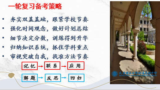 一轮复习务必扎实,一步一脚印。这是因为大部分高考题旨在考查学生掌握的基础知识和基本技能。所以对于绝大多数考生,尤其是对于那些基础知识掌握的较差的学生来说,第一轮复习的结果直接关系到高考分数的高低。这就要求我们在一轮复习中要紧跟老师的节奏,把握好第一轮复习的质量,扎扎实实,一步一个脚印,为高考打好基础。一轮复习是毅力的比拼,只有稳扎稳打,脚踏实地才会练就扎实的功底。因此,建议同学们在一轮复习的时候一定要静下心来,认真的揣摩每个知识点,弄清每一个原理。只有这样,一轮复习才能显出它的成效。