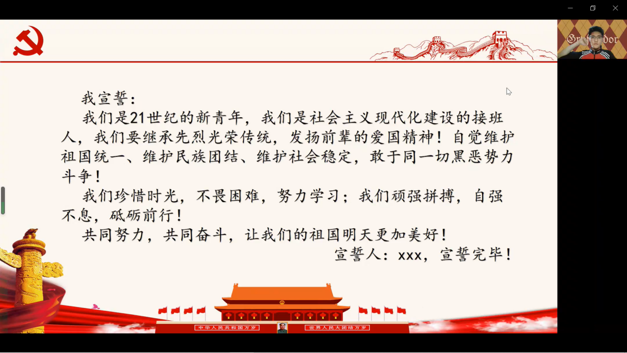 我们身为二十一世纪的青年,如今庄严宣誓。由张柏青同学领誓,全体同学跟誓。