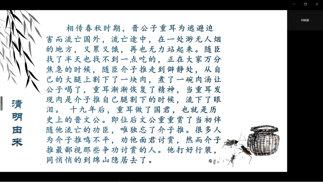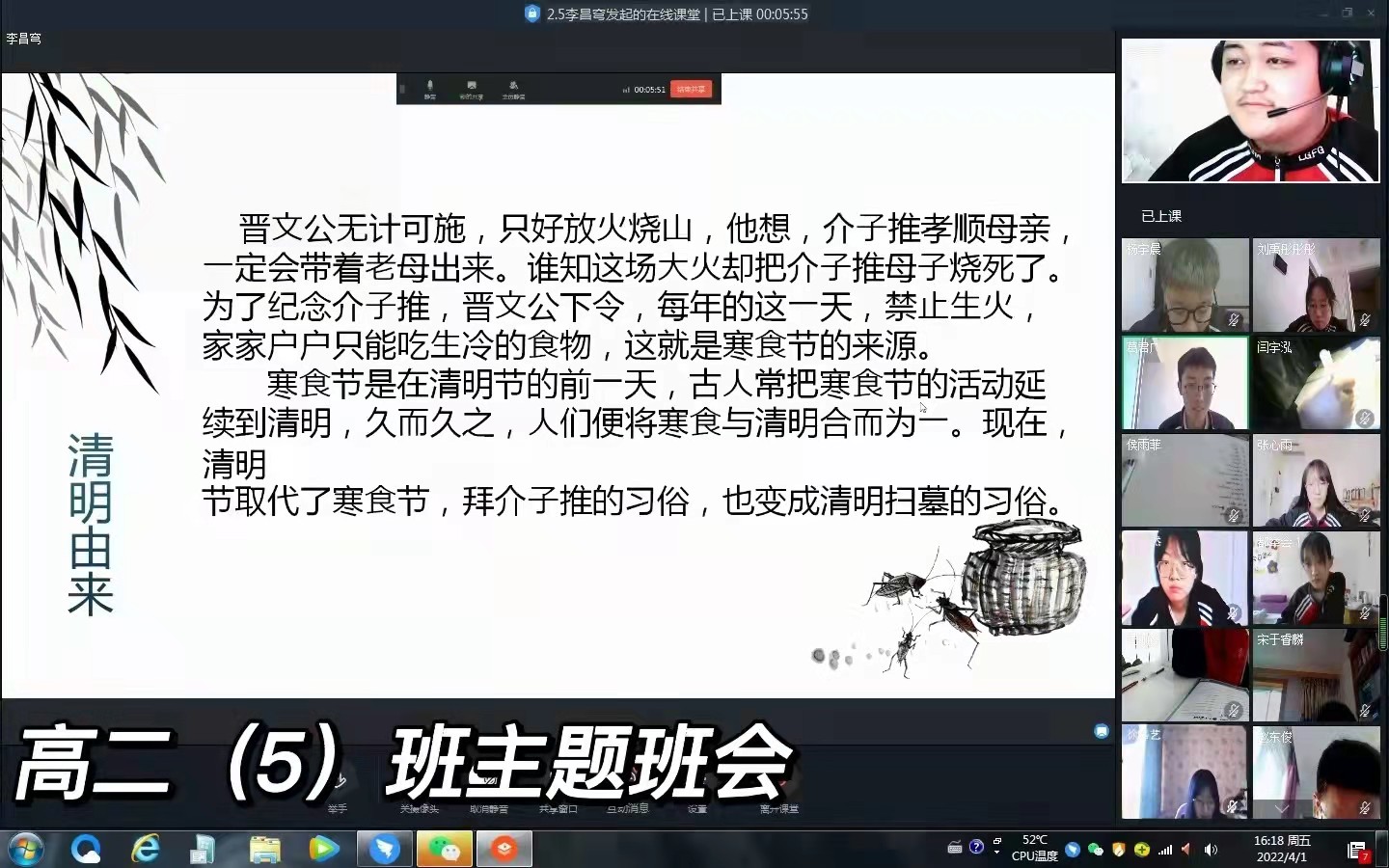 春城无处不飞花,寒食东风御柳斜”清明节是一个古老的节气,最初由寒食节演变而来,变成了节日。在班会的最开始,由何锦豪同学为我们介绍了清明节的由来,讲述了晋文公重耳与介子推的故事。让我们更深入的理解了这个传统节日。