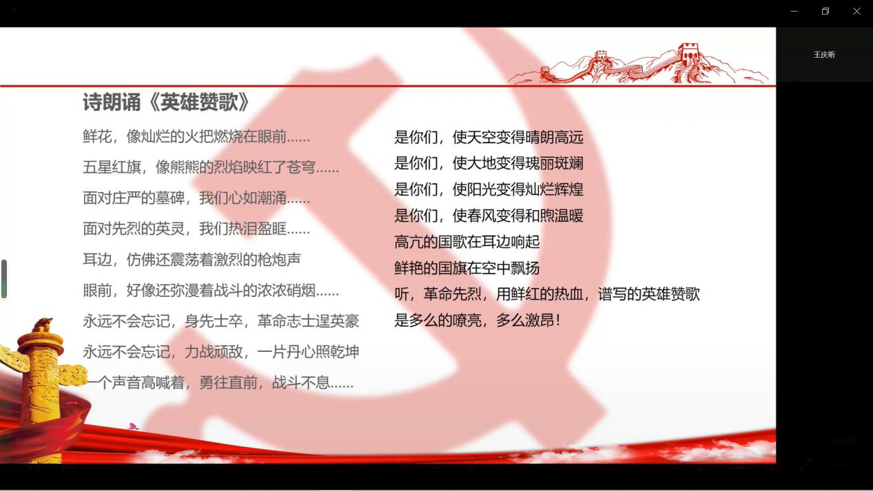 为表达我们对先辈付出的感恩,王庆昕同学献上了诗朗诵《英雄赞歌》。