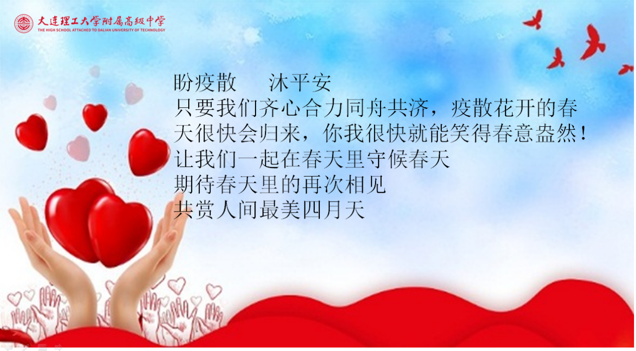 “面对突如其来的疫情,我们能做的只有做好自己。尽公民义务,履学生职责。在这个特殊的时期,决不能失去自制的力量,清醒的头脑,希望和信心。待疫情结束,春暖花开,美丽的校园再相聚!”