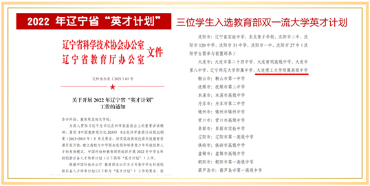 辽宁省科协、辽宁省教育厅联合组织实施的2022年辽宁省“英才计划”遴选和培养工作中,我校为大连市仅有的五所入选学校之一,2人入选大连理工大学化学和数学专业,1人入选东北大学计算机专业。
