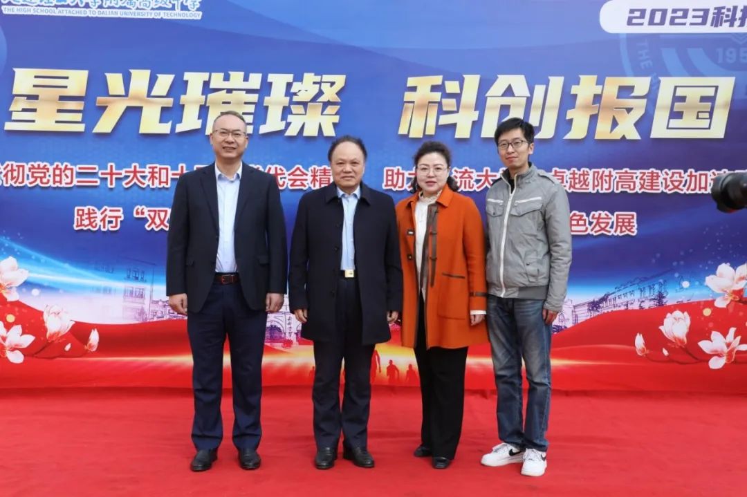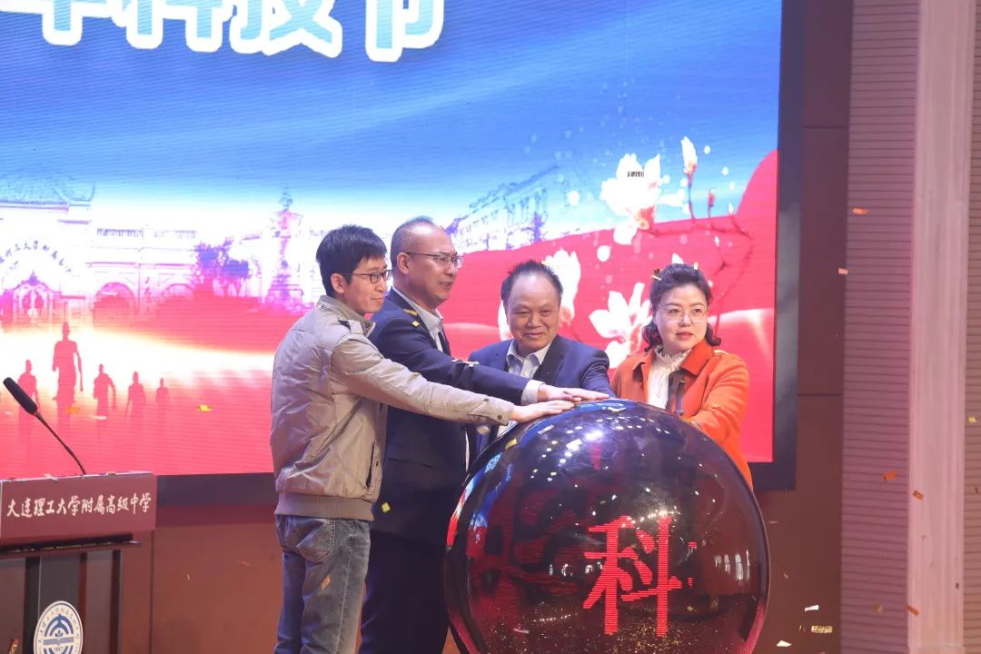 大工附高党委书记、校长赵军携中国工程院院士、亚太材料科学院院士蹇锡高,辽宁省科技馆项目主管丁亮,大连市科协科普部部长张颖共同为科技节按下启动键。