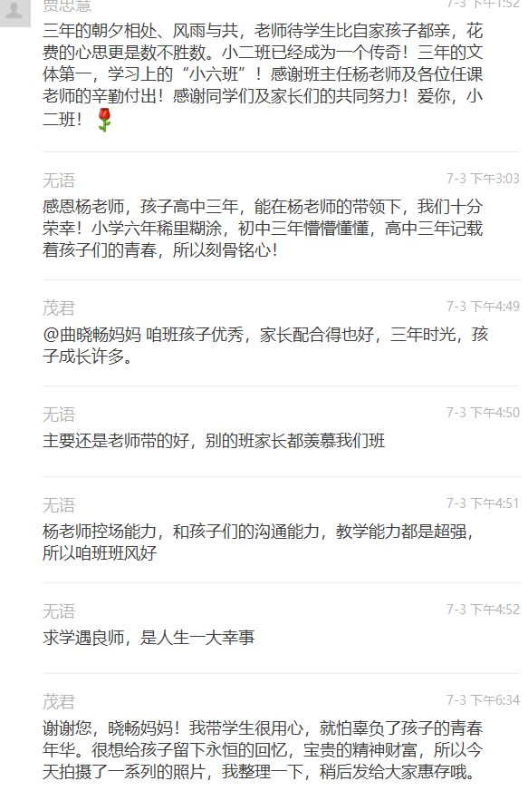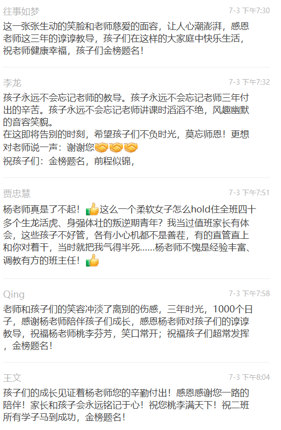 是良师,更是益友,学生和家长的评价忠实地记录了杨老师的付出与收获。一届又一届的学生,一届又一届的家长。在毕业之际,有家长曾满怀敬意地说“此时杨老师是个幸福的人,见证和影响了这么多孩子的成长,您给予的爱和关怀体现在孩子们在分别时刻的笑容上,感谢您一路上的付出和努力!”;也有家长表示“孩子永远不会忘记老师的教导。孩子永远不会忘记老师三年付出的辛苦。孩子永远不会忘记老师讲课时滔滔不绝,风趣幽默的音容笑貌”……