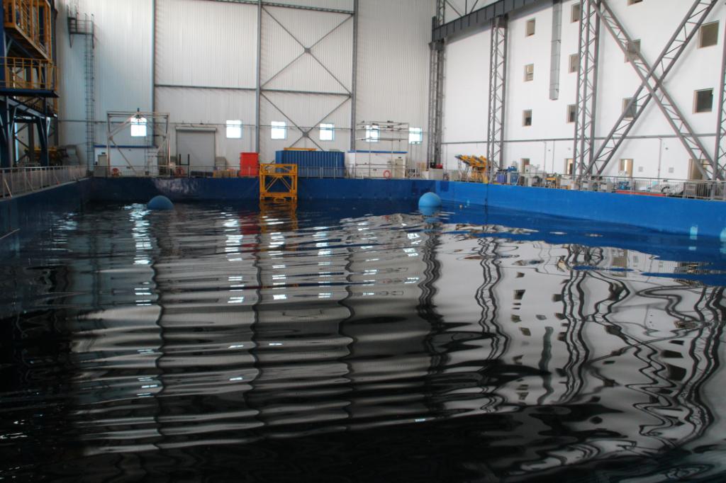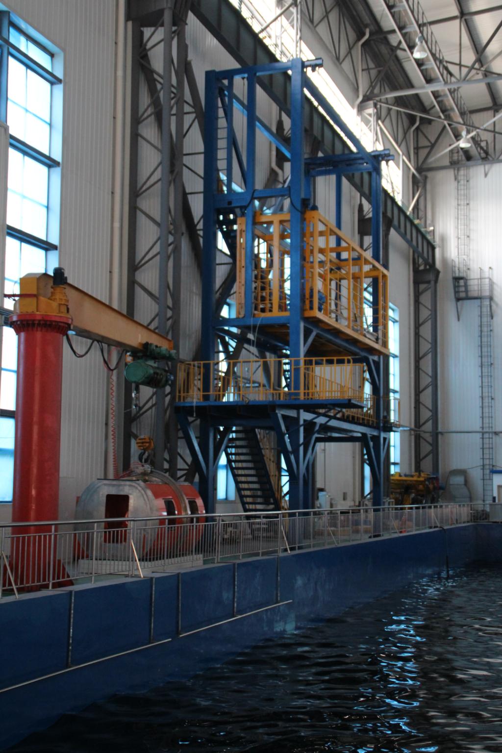 在专业教师的引领下,我们参观了救助打捞工程重点实验室。实验室正中是一座一个宽40米、长50米的模拟海浪水池,两侧深度8米,中间可达15米。角落两个价值四百万的沉浮球下方栓有绳索,可以通过上升下降制造海浪,最多可达6级海浪强度。水池周围是各种救援及模拟设施,如救援舱、急救快艇等。