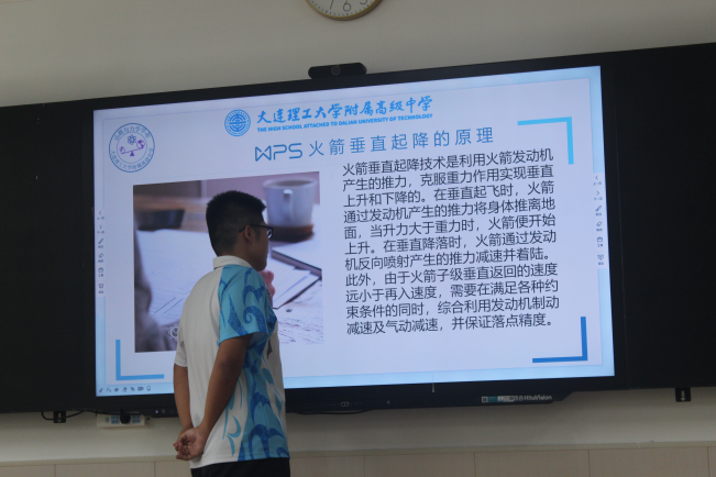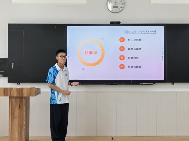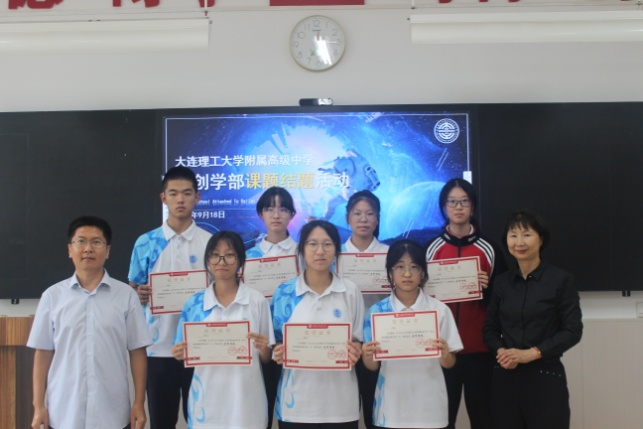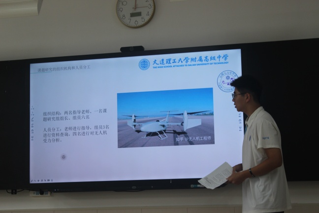 我校有幸邀请到了大连理工大学航空航天学院副院长周文雅教授莅临指导,我校德育处主任李满全程参与活动。在汇报活动中,各小组组长依次上台展示本组课题研究成果,并对研究报告的内容进行细致讲解。