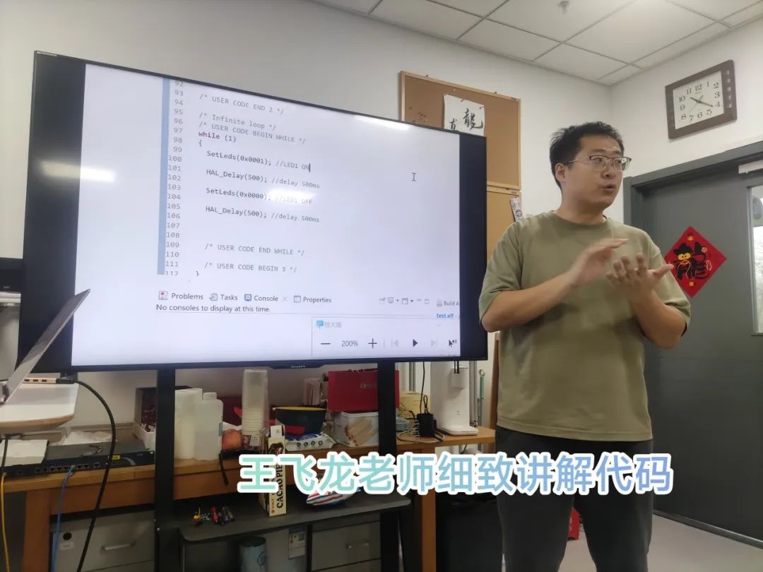 参观完毕,王飞龙老师带领大家学习嵌入式开发。首先同学们下载了STM32CubeIDE,这是一个方便的集成开发环境。打开IDE后,老师向大家讲解了单片机的基本概念、C语言和函数的基本知识,以及控制流水灯的方法。