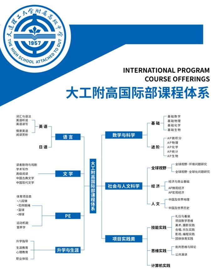 在全球化教育浪潮的推动下,大连理工大学附属高级中学始终坚持“理性教育、诗意发展、科创铸本、国际融通”的办学理念,致力于培养能够站在国际舞台,发出中国声音,提出中国方案的未来中国力量。大连理工大学附属高级中学国际部办学特色鲜明:依托公立基因与大学直附优势,首创“双轨双证”培养体系——深度融合国家课程与国际课程(AP/SAT);构建学部制垂直管理架构,设立与大连理工大学六大学部精准对接的科创学部,实行“中学骨干教师+大学教授”双导师制,实现师资和实验室资源的贯通式导入;形成区域化升学网络,构建覆盖英美体系、东亚名校、国内合作院校的多元出口格局。2024年,全部学子步入世界名校,彰显公立高中国际化教育的创新范式。