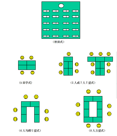 在我国,讨论环境的创设更多的是体现在学生座位的改变上。一般而言,2人配对、4人相邻讨论,对空问场地的变化要求不是很高,较容易实现。如4人一组的空间结构可以设计为“田字格”型,5人或7人一组的空间结构可以设计成“T”型,6人一组的空间结构可以设计为“马蹄”型或“u”型,8人分组可以采用方型排列,等等。