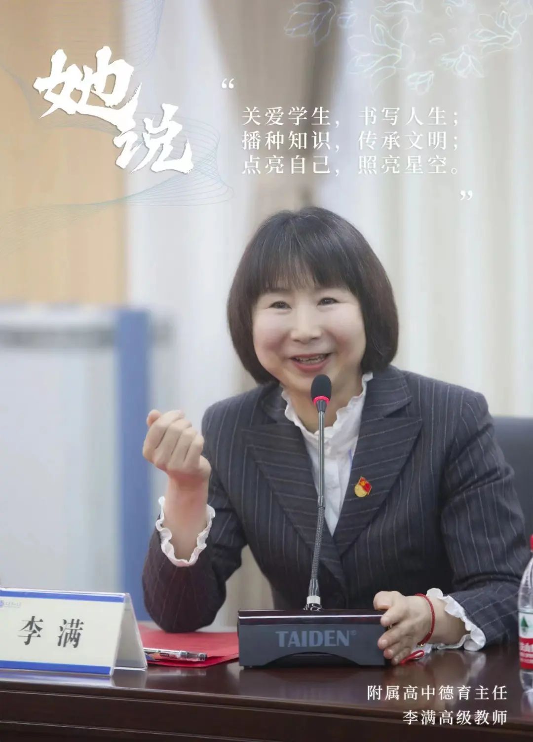 李满主任寄语:“关爱学生、书写人生;播种知识、传承文明;点亮自己、照亮星空”……用点滴平凡故事,书写着教育者的“不平凡”