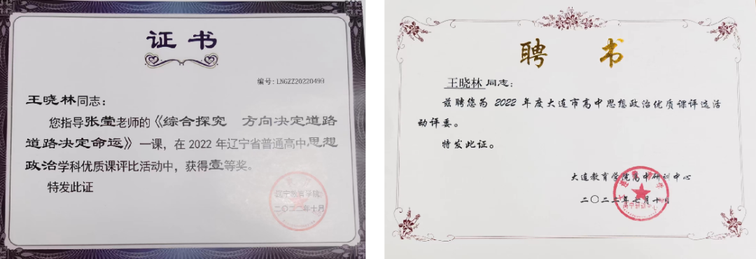王晓林 政治教师,现任高三六班班主任,为2023级新高一预备班主任。辽宁省学考命题组成员,辽宁省高考命题推荐人,大连市骨干教师,大连市教育学会高中政治教学专业委员会理事,大连市高考模拟命题组成员,多次参与省市教研活动,多次参与大连市高三模拟命题活动,多次参与大连市高一高二高三期中期末命题,多次担任大连市高中思想政治学科优质课大赛评委,多次担任教师资格考试评委,多次参编《高中新课程评价与检测》和《时政热点》,多篇论文在国家及省级刊物发表交流。两节课被评为大连教育数字课堂优质课。