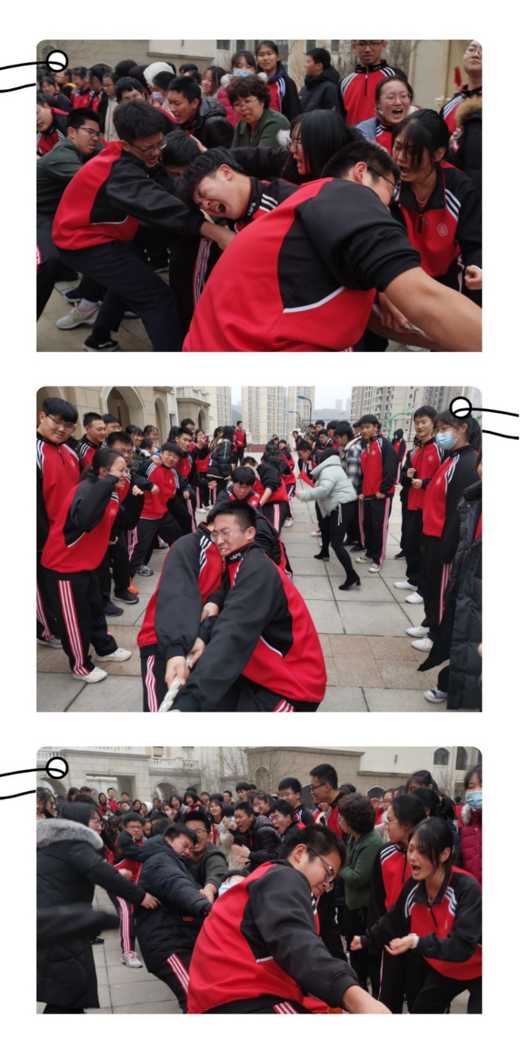 这次拔河比赛,是在新冠肺炎疫情防控常态化的大背景下举行的。这种群体性户外活动有力地舒缓了学生因疫情及课业负担带来的紧张节奏,有利于培养健康的心理;激烈的团队比赛,加强了学生体能锻炼和户外运动习惯,有利于培养合作意识、团队精神和集体荣誉感;寒冷的竞技环境,更有力地锻炼了学生不惧困难、迎难而上的意志品质。