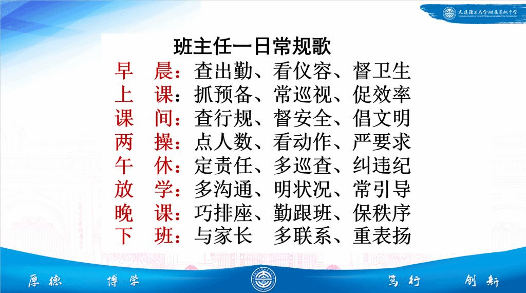大工附高德育工作以立德树人为根本任务,践行五育并举,紧紧围绕“让每个生命翩翩起舞”的办学宗旨。德育处全体老师将以系统观念、整体思维来协调工作,合力进取,着力提升我校德育工作的规范化和制度化管理。
