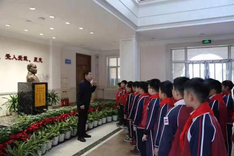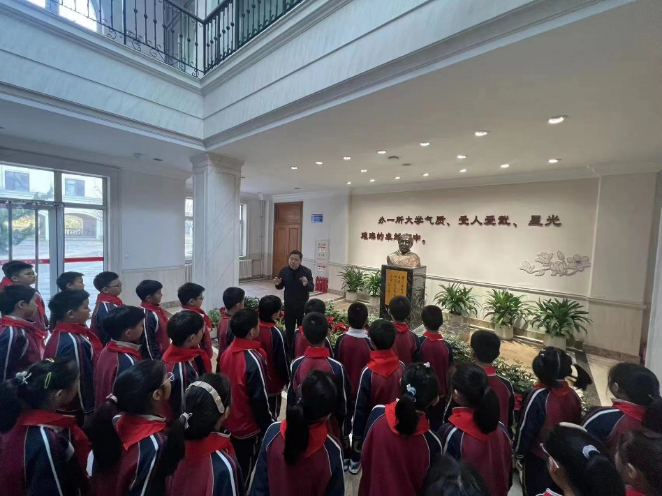 为积极推进大中小学思政教育一体化建设,在实践过程中,大工附高积极开放本校的校园文化空间,大力促进各学段校际间的友好联动,以实现和联盟学校的资源共享。11月29日,理工附校圣克拉校区小学部的少先队员们佩戴着鲜艳的红领巾,在石磊副校长的带领下参观了令希厅。