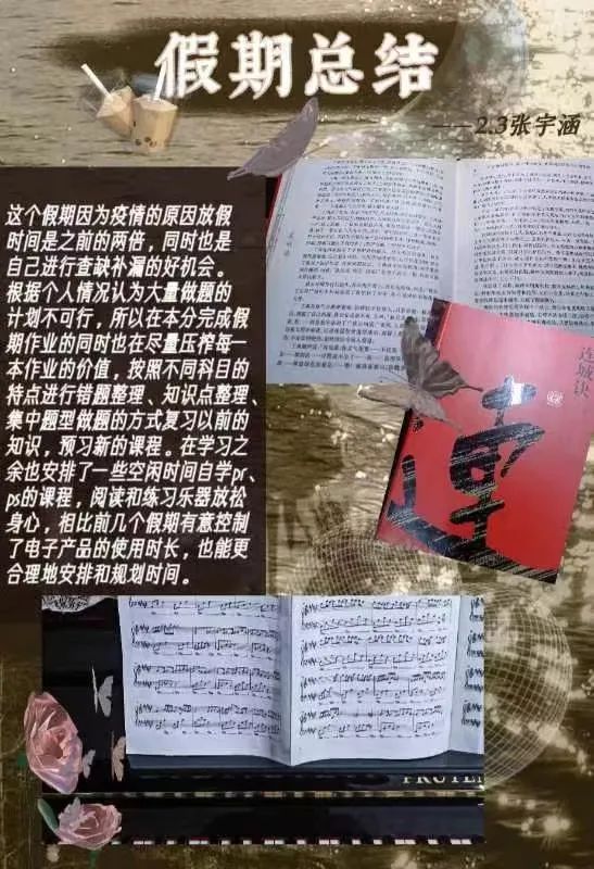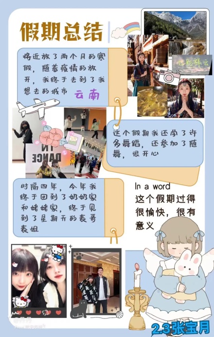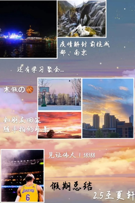 世界上最快而又最慢,最长而又最短,最平凡而又最珍贵的就是时间。转眼间我们的寒假已经进入了结尾,虽然我们的这个假期开始的比较仓促,但是随着疫情的结束,同学们也对自己的假期进行了充分的安排,比如重新安排因为疫情所耽误的旅行,见见许久未见的亲人朋友,或者培养自己的爱好……这个假期同学们充实着自己生活的同时,不断丰富着自己的知识,从身体到心理上都是一次很好的放松,与家人们迎接了新学期的到来,接下来便是同学们的自我总结。