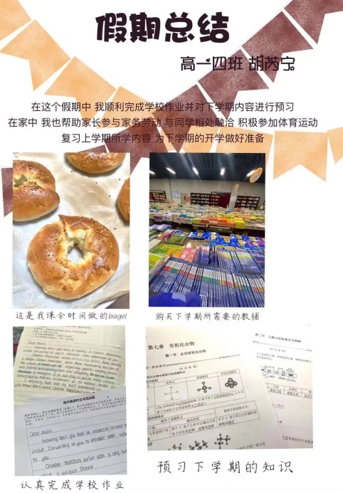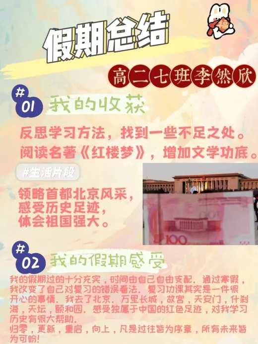时光匆匆,所以我们才要加倍努力。看到同学们的假期总结,再一次感叹同学们的假期如此的丰富,不仅仅局限于一种形式,在不落下学业的同时,还去了自己喜欢的地方旅行,培养了自己的兴趣爱好,调整好了自己的心态,为开学之际做好准备,即使我们马上又将步入紧张忙碌的学习生活中,但是我们已经充满了能量,也准备好迎接新的挑战。开学考,合格考…陆陆续续的大考小考即将铺满我们的校园生活。希望亲爱的同学们能够在假期最后的几天里,继续加油,为新学期做好准备!最后一句话希望大家共勉“少壮不努力,老大徒伤悲”!