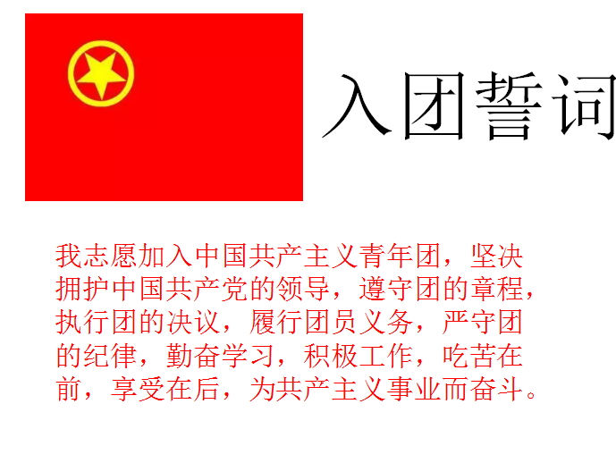 我志愿加入中国共产主义青年团,坚决拥护中国共产党的领导,遵守团的章程,执行团的决议,履行团员义务,严守团的纪律,勤奋学习,积极工作,吃苦在前,享受在后,为共产主义事业而奋斗。