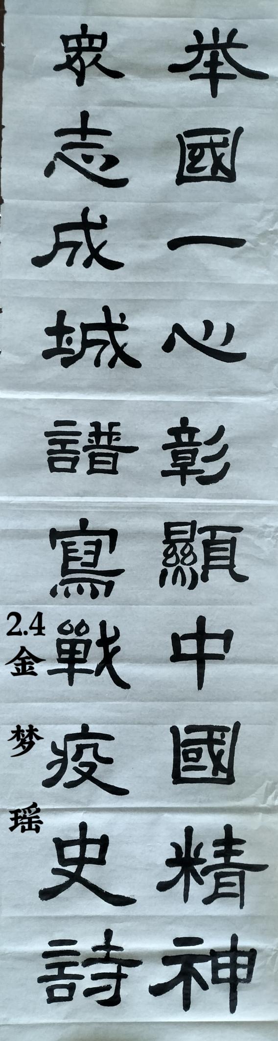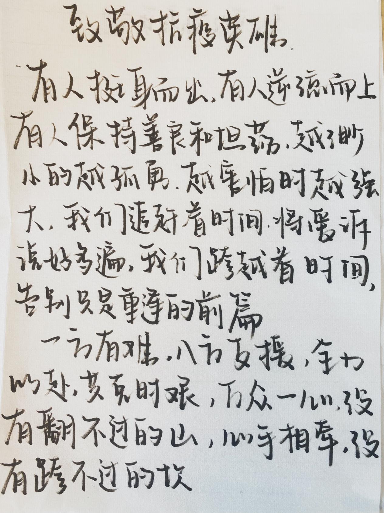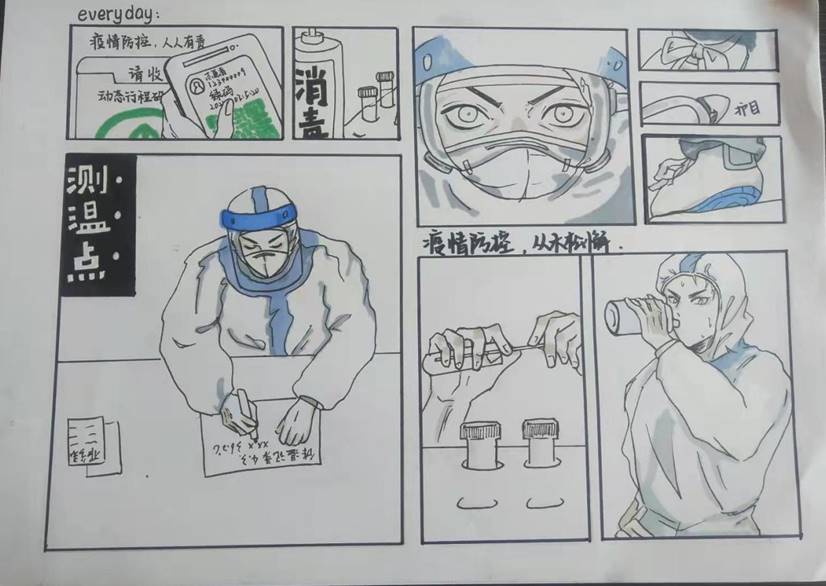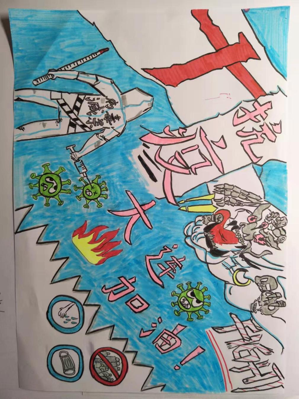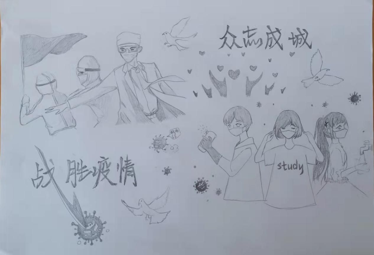 面对新冠病毒的滋扰,我们关注疫情,大工附高面向全体学生提出了“以艺抗疫 共克时艰”的倡议:我们心怀感激,用书画挑起一份厚实的社会责任,面对新冠病毒,肩挑使命,书画战“疫”、迎面出击!大工附高的学子们第一时间拿起画笔,积极创作抗疫主题书画作品,用笔墨鼓舞抗疫斗志,用笔墨礼赞抗疫英雄。我们愿为生命健康保卫战助力加油;我们愿用少年手中的笔和“最美逆行者们”一起抗击疫情;我们更愿用翰墨抗击“疫情”,鼓舞这个时代!