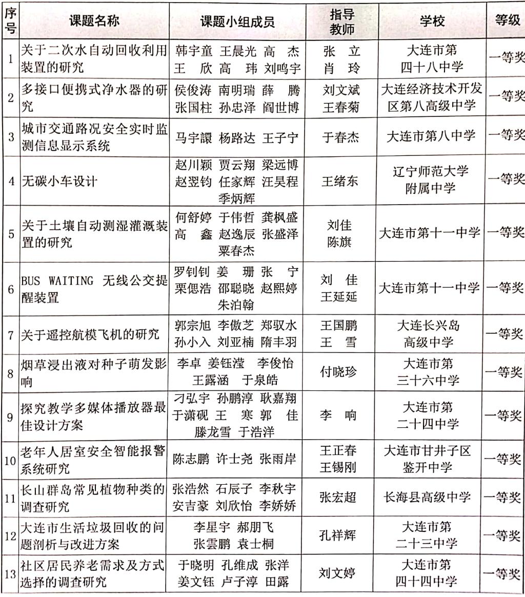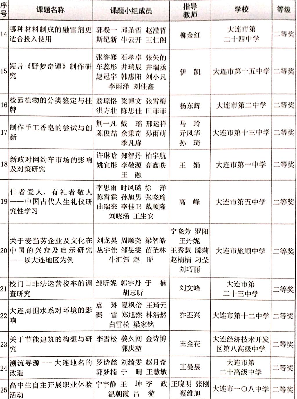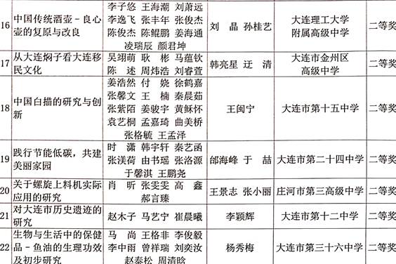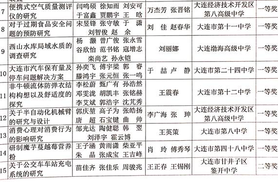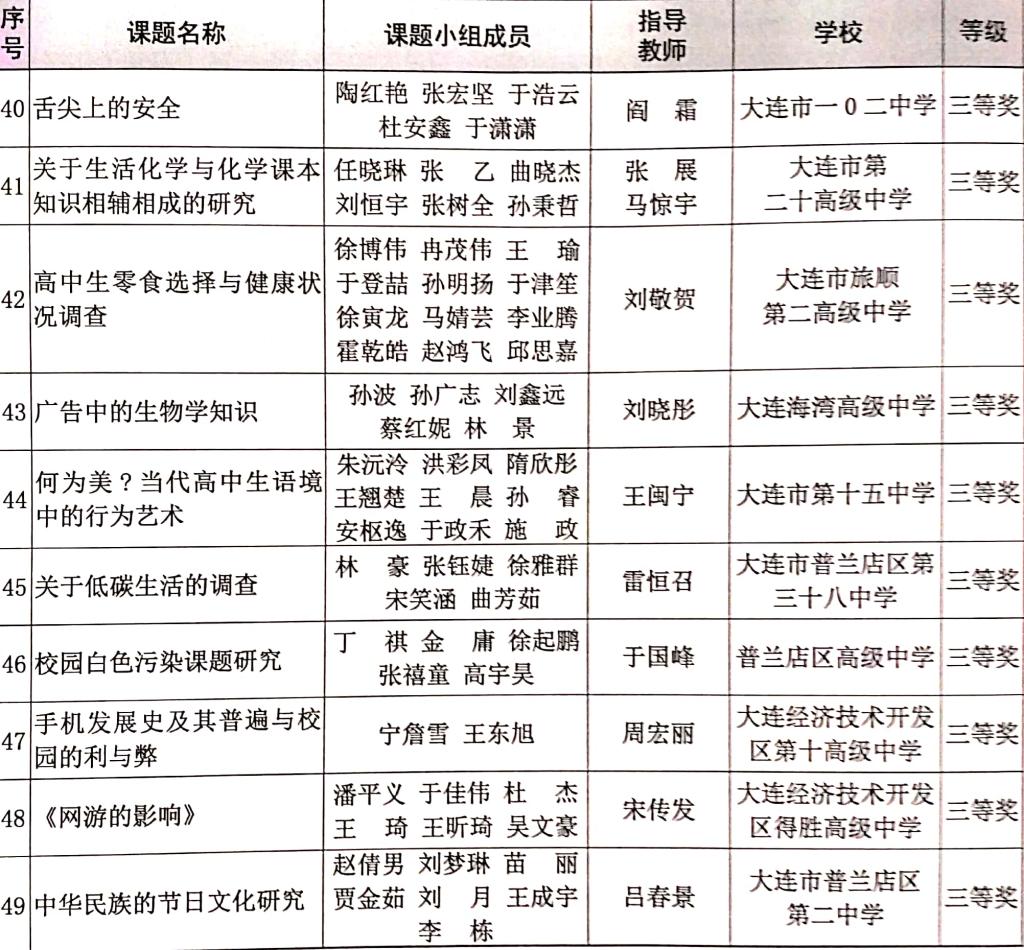 研究性学习是教育部制定的《普通高中课程方案》(2017年版)中课程设置规定的综合实践活动的重要组成部分,是高中生的必修课,需完成两个课题,获得6学分。研究性学习具有综合性、实践性、开放性和创新性的特点,对于提升高中学生的学科知识交叉运用能力、实践应用能力、科技创新能力和科学思维具有重要作用。要想做好研究性学习,首要环节就是开题阶段选择一个好的课题题目,所谓好的课题题目就是此研究题目具有可行性、科学性、创新性、应用性、地域性、传统性、普适性等特点,而不是千篇一律的调查统计类的题目。为指导高一学生选择一个更好、更适合本课题组的题目,特把近四年来大连市教育局评比的获奖课题题目印发给同学,希冀对大家有所裨益。